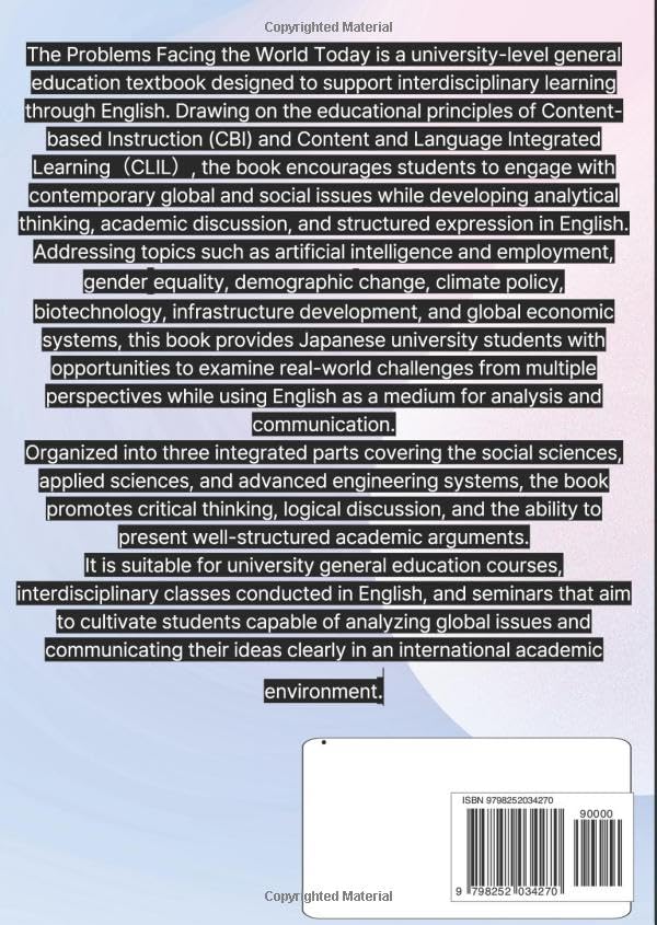 このような大学での英語教育はCBIやCLILという英語教育学を取り入れたものであり、今後もこの流れに変更はなさそうです。ただ、問題は、日本人大学生向けのCBI,CLIL授業用の適当なテキストがあまりなかったことです。本書は大学英語での討論、ディベート、プレゼン用の包括的な初めてのテキストです。
